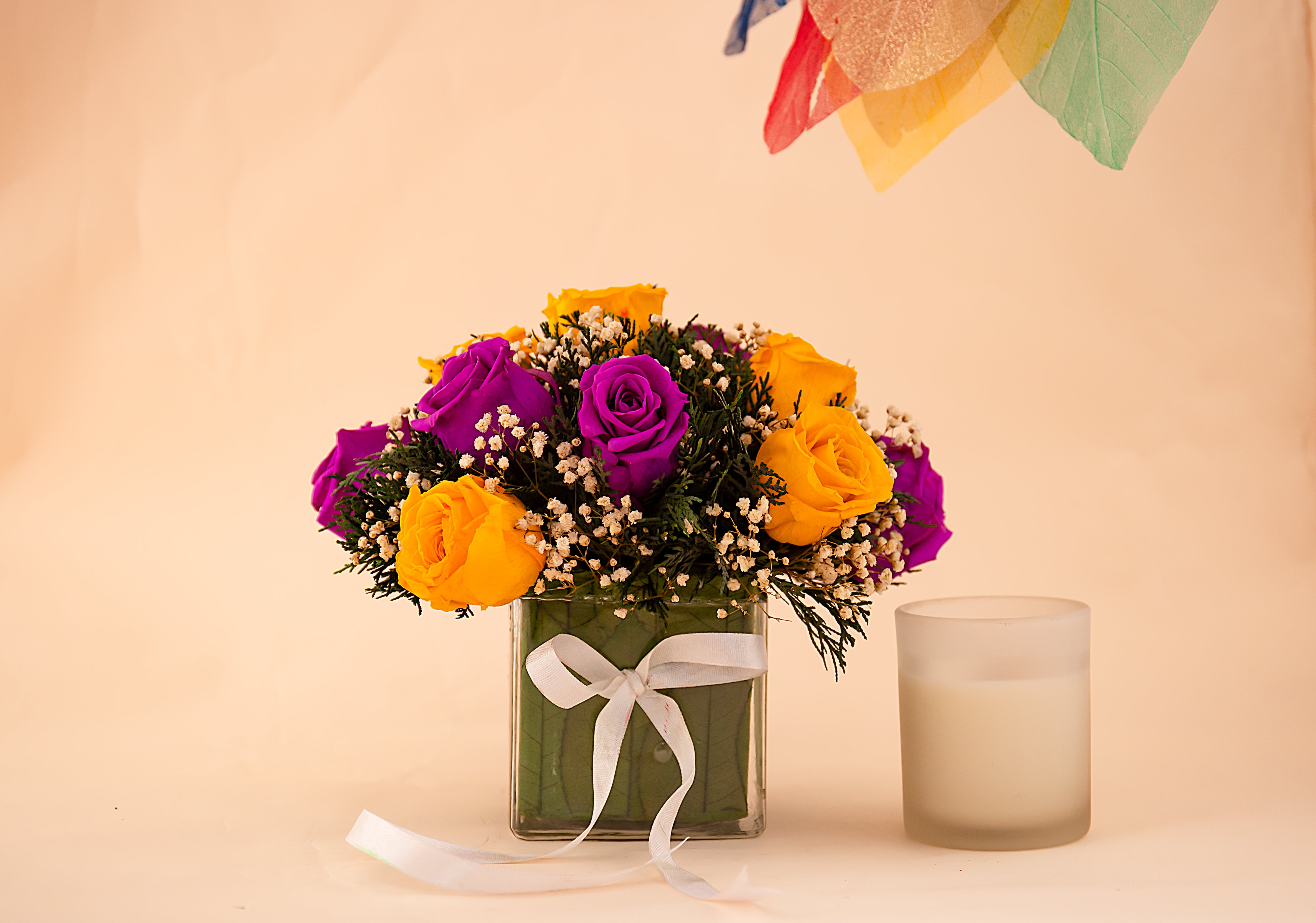 All our flowers are grown in India. The size of the flowers in the arrangements may vary depending on the season and availability.