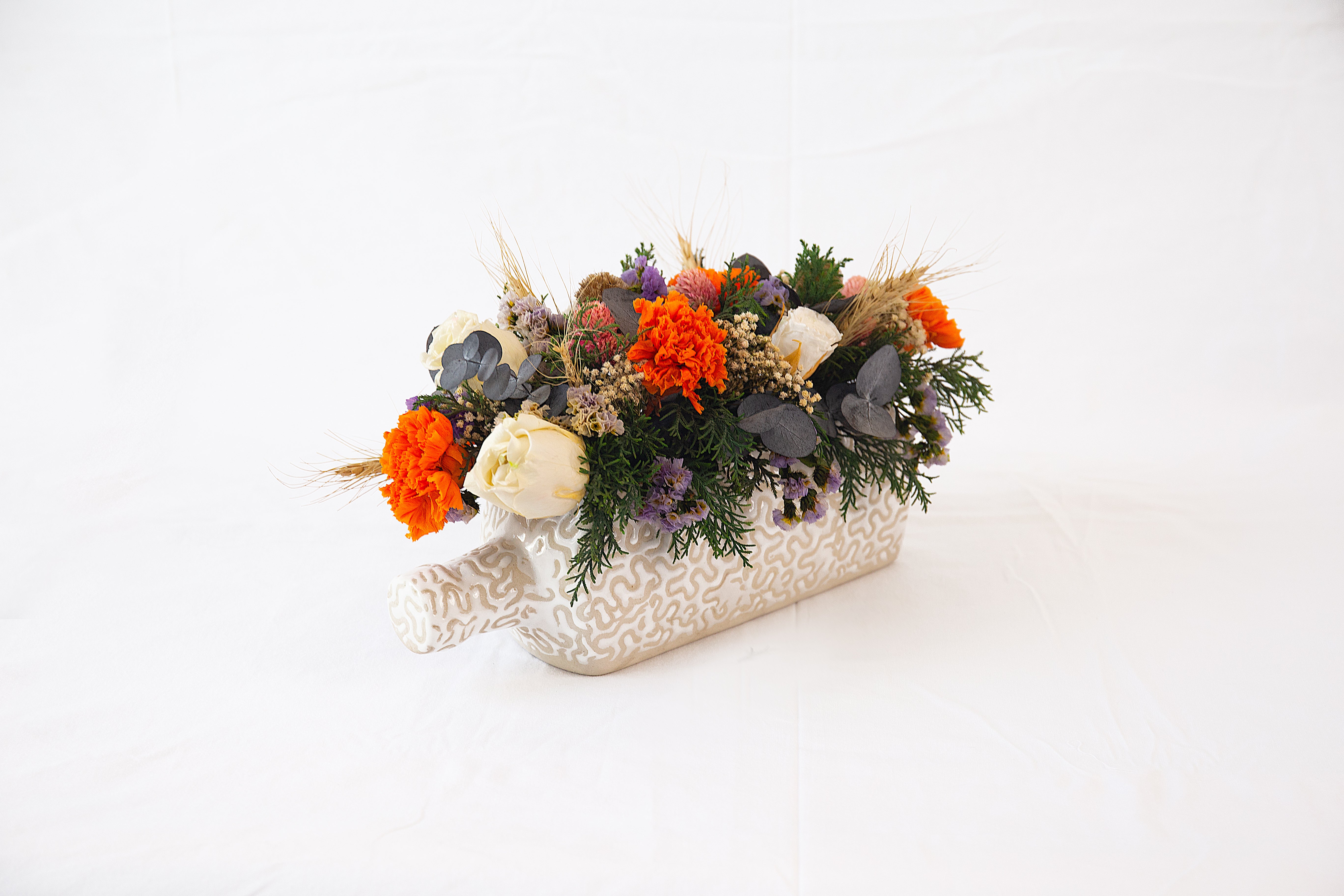 Experience the epitome of beauty with our stunning bouquet of classic roses, delicate carnations, and intricate statice. Enhanced with wheat, gomphorena, baby dollar, gypso, and Cyprus, this unique arrangement is sure to impress with its elegant charm. Indulge in a touch of luxury with our Epitome bouquet.