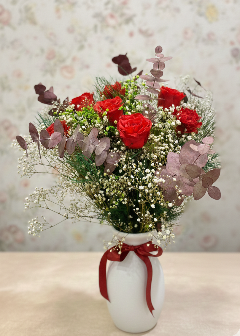 Experience the refreshing beauty of our Frosty Twilight bouquet. Enjoy the delicate mix of Gypsophila, Bottle Brush, and Baby Dollar, arranged perfectly in a vase. With a touch of frost, this bouquet will bring a unique and elegant touch to any room. Order now to brighten up your home or surprise someone special.