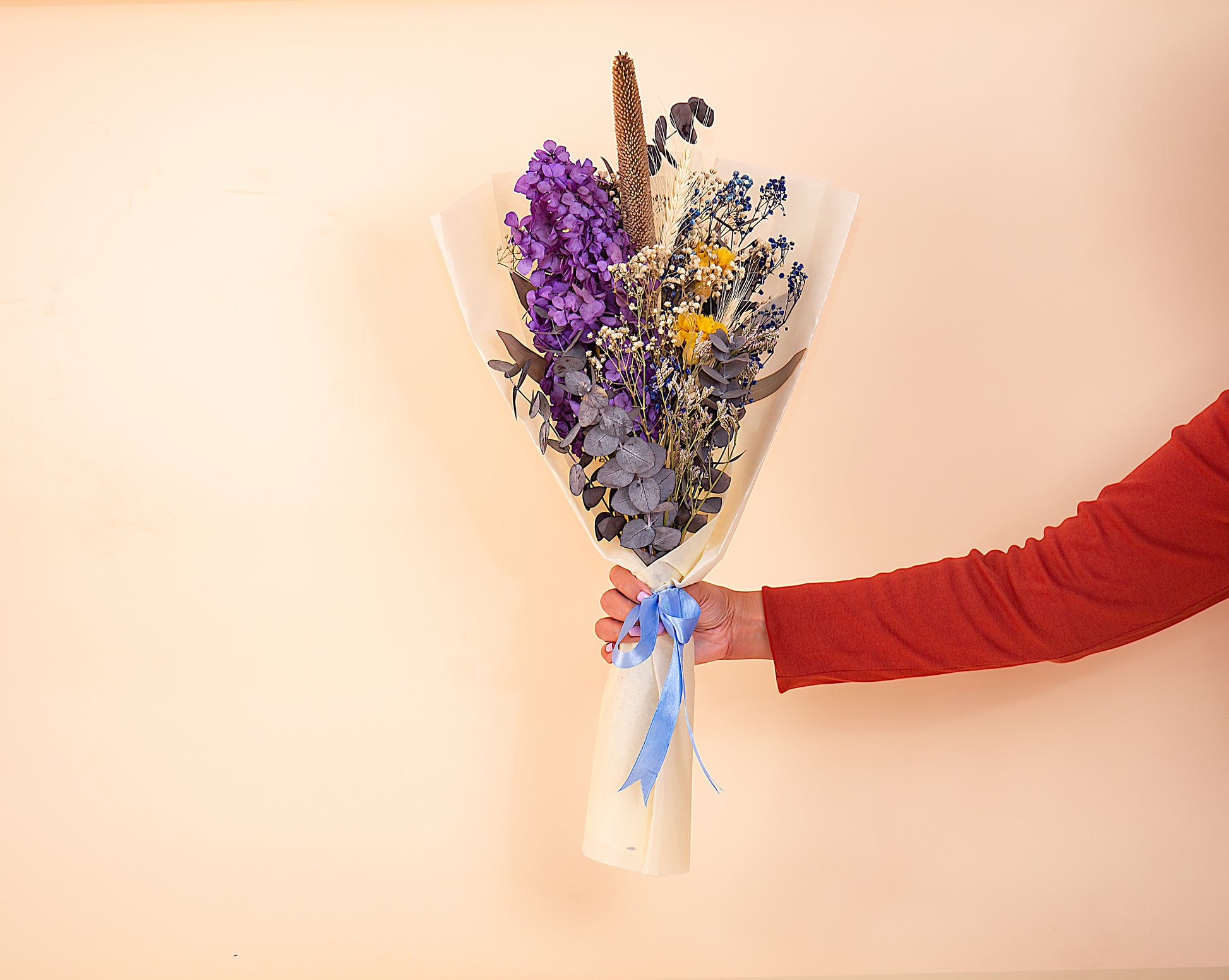 Garden Whispers is a stunning bouquet featuring a beautiful mix of Blue Pampas, White Rose, and Yellow Craspedia, accented with Cyprus and Lotus Pod Seeds, Baby Dollar, Grevilla, and Gypsophila. Bring the beauty of the garden into your home with this unique arrangement.