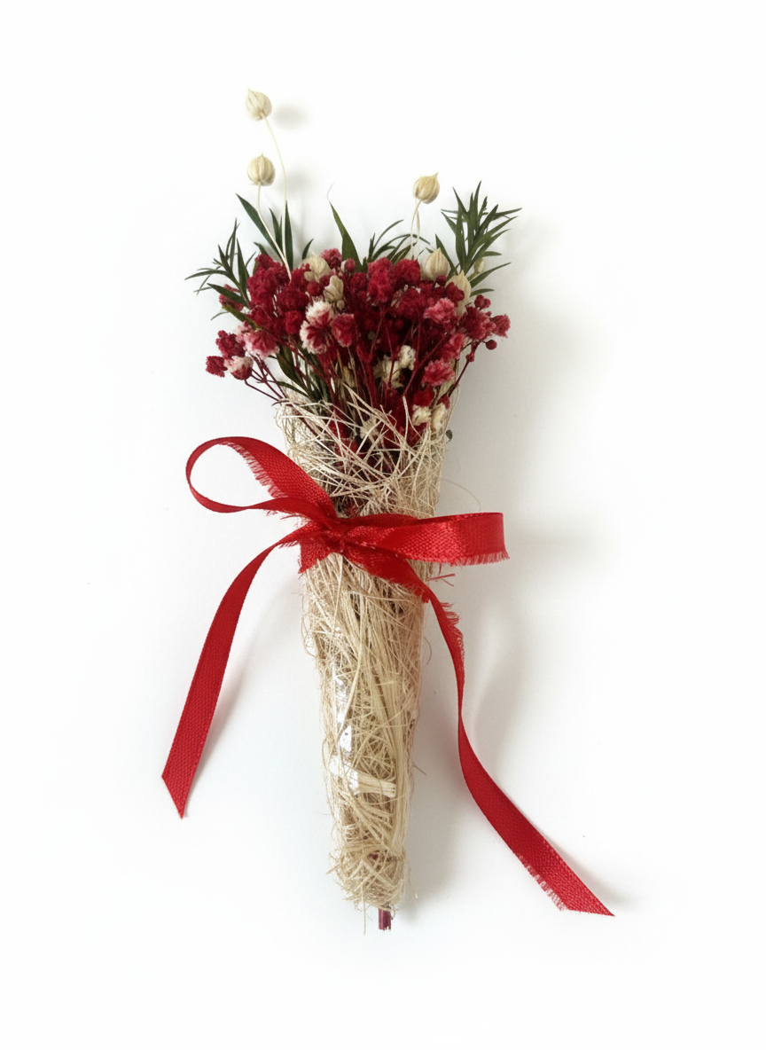 Introducing the Small Bunch, an elegant arrangement featuring a single Carnation, a sprig of Wheat, a Baby Dollar, a dash of Gypso, and a touch of Cyprus. Perfect for adding a touch of natural beauty to any space.